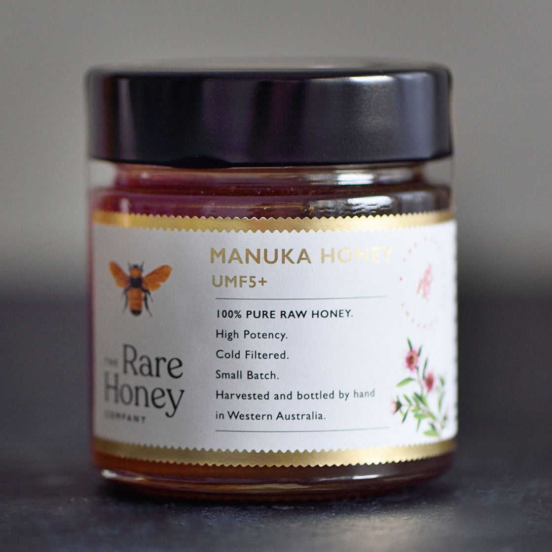 Our Manuka honey is mono-floral, meaning it is made from one species of flower. It is produced by bees that have fed on the Leptospermum tree, which flowers fewer than six weeks a year and grows wild in Australia.